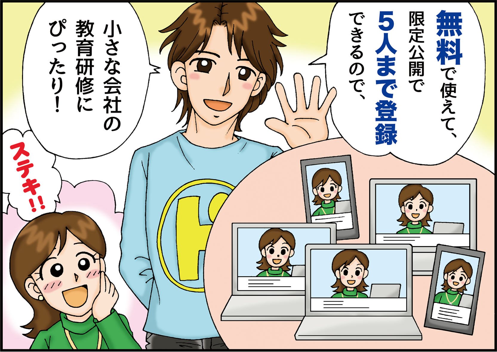 ドリルメイト(R)なら無料ですぐに導入できて、「限定公開」機能を利用すれば、5人までの小規模なeラーニング研修をスタートできます。(※人数が増えたら、ドリルメイトProのご利用も是非ご検討ください。)