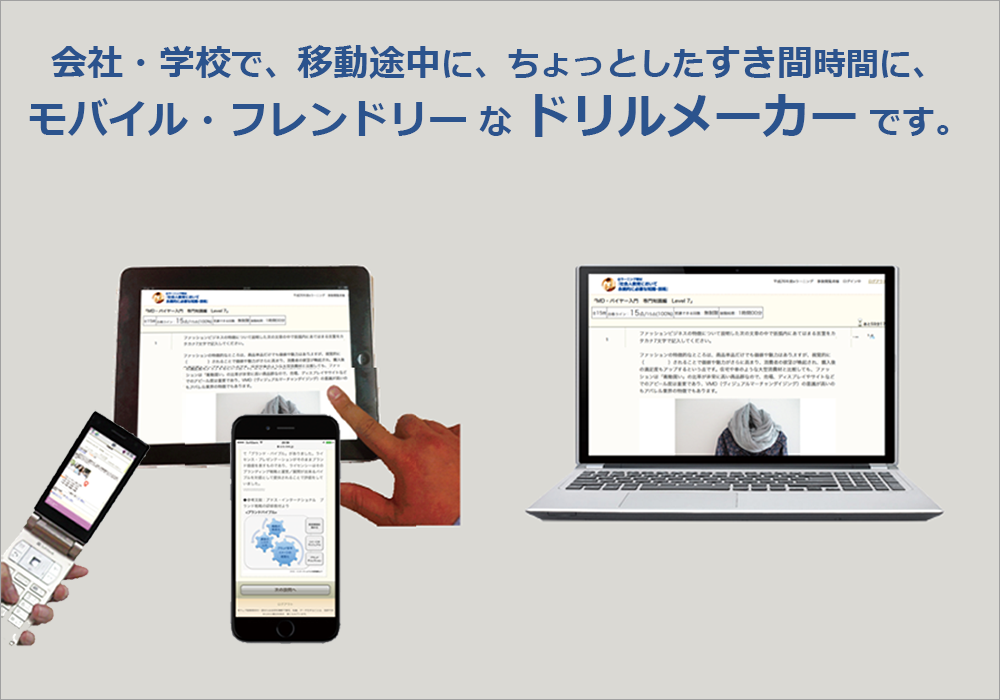 ドリルメーカーは、基本設計段階から、携帯電話(フィーチャーフォン)を含む、マルチ端末間の横断的利用を想定したシステム作りを行っています。