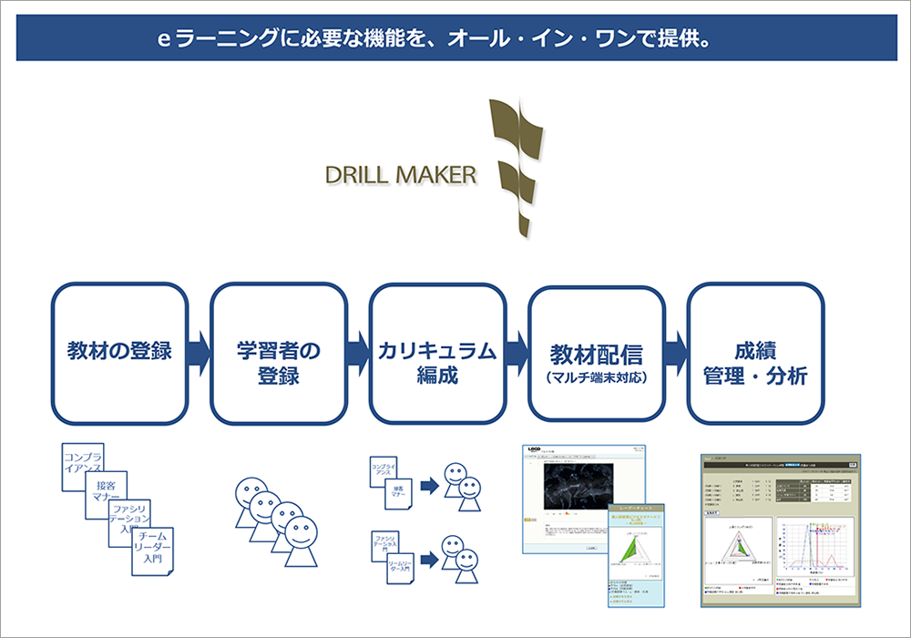 日本ドリルメーカーは、レンタル型でありながら、本格的なeラーニングの管理者機能を、オール・イン・ワンで提供します。
